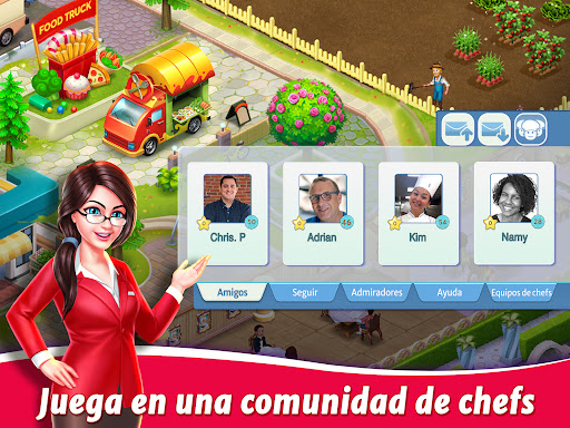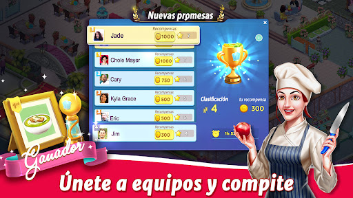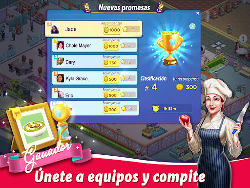 Chatea y haz equipo con tus superchefs. Explora las características del juego y únete para colaborar y participar en torneos.
