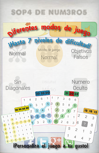 Todas las variantes de juego incluyen hasta 7 niveles de dificultad. Desde el Modo Niños, para los pequeños de la casa, con un tablero de 3x3 para esas edades en las que les gusta hacer sumas simples. Hasta el nivel imposible, en un tablero de 9x9 que realmente supone un reto...