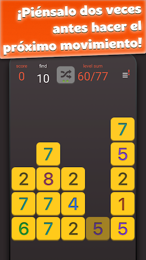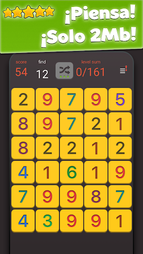 - Si ya no hay más movimientos y la suma de todas las sumas recolectadas es mayor que la suma de números que quedan en el campo, entonces ha completado este nivel y puede pasar al siguiente.