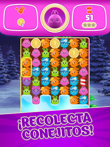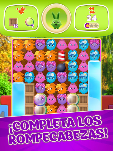 Únete a tus cinco conejitos esponjosos favoritos, Big Boo, Hopper, Shiny, Iris y Turbo mientras cobran vida en su primer juego de rompecabezas. Completa muchos niveles desafiantes tocando para hacer coincidir dos o más de los mismos Sunny Bunnies juntos. ¡Cuantos más conejos puedas igualar, más grande y mejor será tu explosión!