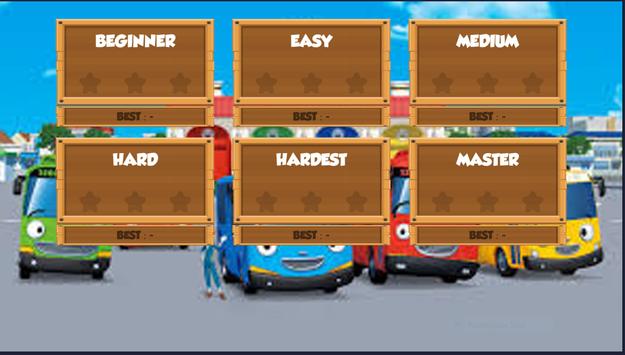 This game consists of 3 levels, level 1, Tayo in it consists of 4 pictures as a reminder. level 2 his name Rogi in it consists of 6 images as reminders and level 3 his name Gani in it consists of 9 pictures as a reminder.