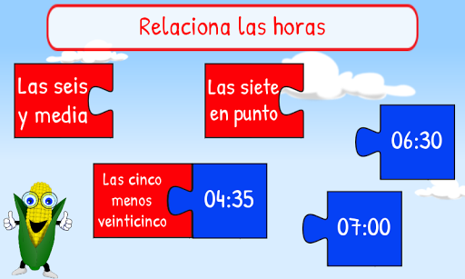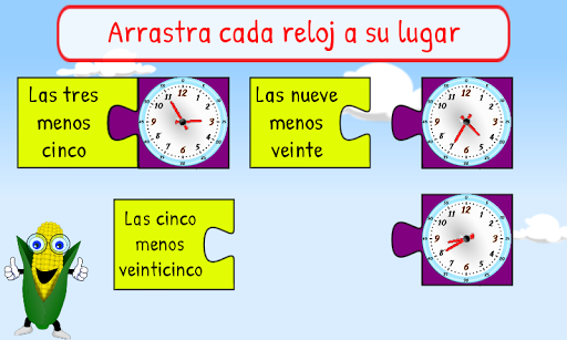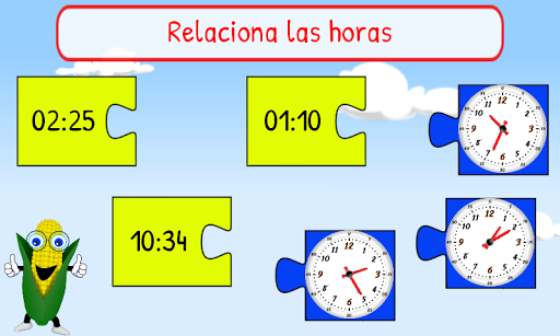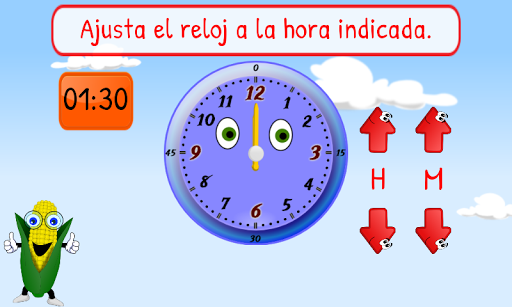 Los más pequeños podrán practicar poco a poco las horas, los cuartos, los minutos y finalmente mezclar todo lo aprendido, acompañados de actividades interactivas y simpáticos dibujos. Además, en las primeras actividades dispondrán de audio como ayuda.