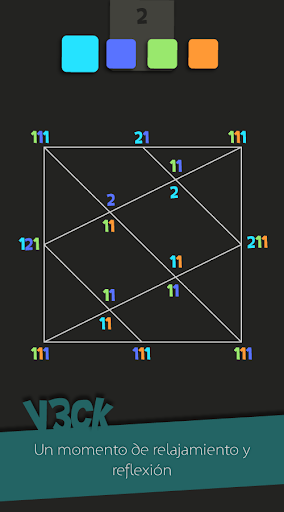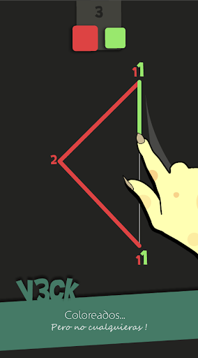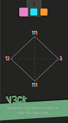 Para ganar en V3ck, tendrás que completar cada rompecabezas encontrando el color de cada línea, ayundándote con números situados en los vertices. Cada cifra representa el número de líneas que empieza desde el vertice, junto con su color ! Tendrás que deducir las soluciones de cada enigma (acertijo) como si se tratara de un sudoku. Más seguirás adelante, más difíciles serán los puzzles!