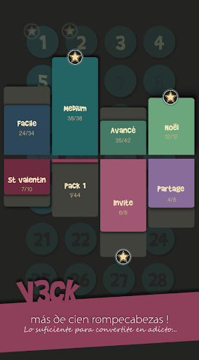 Sobre la base de un sistema de color y forma, V3CK es un juego de puzzles (ou rompecabezas) que probará tu (sentido de la) lógica. Adeptos del sudokus y de los enigmas, descubrid una nueva manera de pasar el tiempo con muchos rompecabezas!