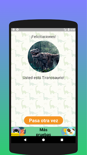 ¡La prueba presenta muchos dinosaurios, y uno de ellos definitivamente te quedará bien! ¡Esto no es un simulador! La prueba compara tus respuestas con los hábitos y el comportamiento de diferentes dinosaurios, y determina con quién de los dinosaurios tienes más coincidencias.