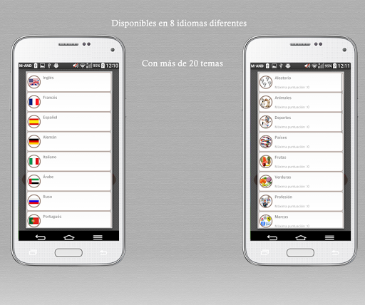 - Disponible más de 18 temas a elegir:Deportes,Animales,Países,Frutas,Verduras,Profesión,Marcas,Elementos químicos, Ciudades del Mundo, Personajes Históricos, Navidad, Los mejores equipos de fútbol, Personajes de cómic, Astronomía, Matemáticas&Geometría, Economía, Música, Actores de Hollywood, Anatomía