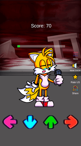 What to do in the game FNF Tails Mod Test Character? You need to score the most points. Before starting the game, select the state of the hero and the music that you like best, and then click play. After starting the game, click on the arrows on the screen of your device and earn points. If you scored 1500 points, this is a good result of the game. If you managed to score more than 2000 points - you are great at FNF Tails Mod Test.