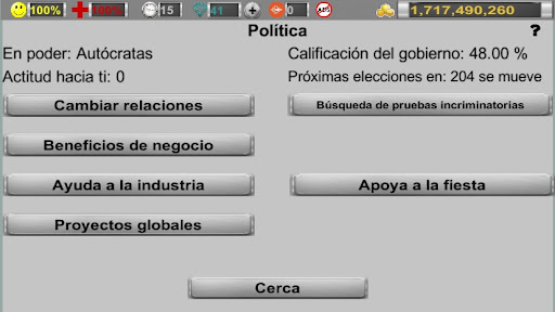 - la capacidad de atraer inversiones en su negocio y negociar con las acciones de sus empresas. Tus declaraciones tendrán diferentes efectos dependiendo de la popularidad de tu personaje.