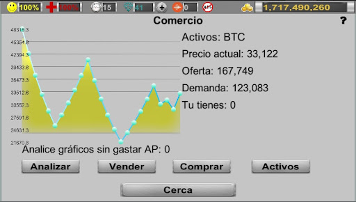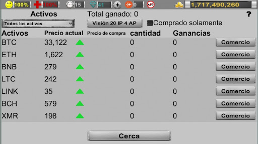 - la capacidad de negociar más de 40 activos en el intercambio. Las acciones, los bienes y las criptomonedas reaccionan a los cambios en el estado de la economía en el juego, y con ganancias suficientemente altas y buenas relaciones con los políticos, el jugador mismo podrá influir en el mercado;