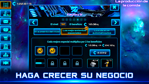 Este universo de ciencia ficción te está esperando. Como magnate de los negocios, piense en su estrategia de desarrollo: produzca bienes usted mismo, aumente la capacidad de producción o simplemente compre bienes en el mercado global. Pasa mucho tiempo en el juego, gana mucho dinero o sé un magnate perezoso y solo recolecta ingresos en efectivo inactivos. Si no hay suficiente dinero para el juego, simplemente obtenga créditos bancarios. Esto no es solo un clicker o un juego inactivo o de tapping, es como un juego de simulador de negocios.