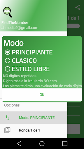 La evaluación de Android, como en el Modo Clásico, solo le dirá la cantidad de dígitos que están posicionados correctamente y la cantidad de dígitos que están en el