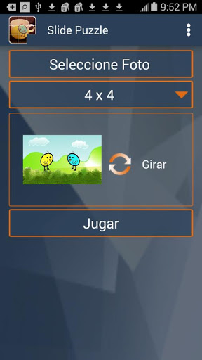El Slide Puzzle es gratuito y fácil de usar. Hay una opción para seleccionar sus fotos favoritas desde el teléfono y convertirlos en puzzles. Caricatura de niños gratuito también está disponible desde el menú. Rotación de la imagen está disponible cuando sea necesario. Rotar imágenes 90 grados con cada toque en el icono de rotación.