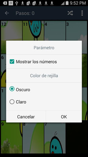 Mientras que en el tablero de juego, puede mostrar u ocultar los números de pieza del rompecabezas y se podía cambiar el color de la cuadrícula y números.