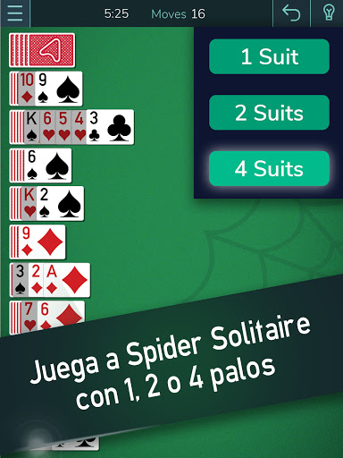 Puedes jugar a Spider Solitaire gratis y elegir entre cuatro, dos o un palo de cartas al seleccionar la partida. Disfruta hoy mismo de uno de los mejores juegos de cartas de todos los tiempos.