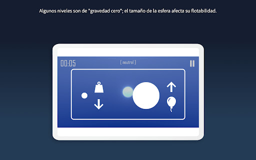 Una cosa más. Algunos niveles son "bajo el agua", con el tamaño de la esfera cambias su capacidad para flotar. Para flotar puedes crecer y para bajar puedes reducir el tamaño de la esfera.