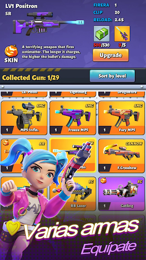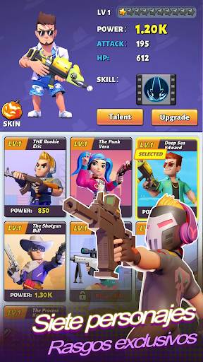 Supera fases y desbloquea nuevos personajes. Cada personaje tiene habilidades únicas y especialidades de armas. Aumenta más su poder mejorando los talentos y te ayudarán a acabar con quien se interponga en tu camino.