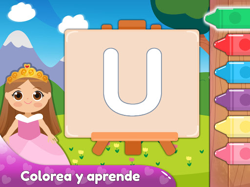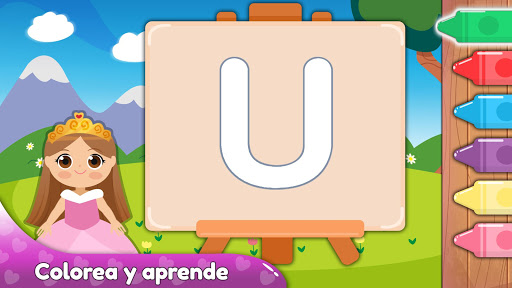 Dibuja la letra, ayuda a la princesa a colorear las vocales, descubre la divertida animación que tiene cada letra.