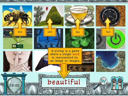 D-Pixing! Es un rompecabezas fonético único, inspirado en los populares juegos de rebus, donde las imágenes representan palabras. Este moderno BEBUDDLER traza sus raíces a los pictogramas, la forma más temprana de escritura de 3,400 aC. Los jugadores reciben una palabra y deben encontrar las ilustraciones de sonido silábico que conforman la palabra.