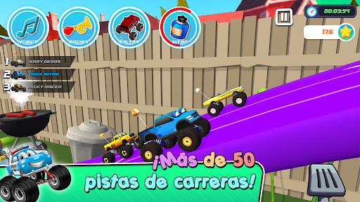 Divertidos botones coloridos para saltar, tocar la bocina y cambiar la pista de música o activar el nitro para acelerar por delante de los otros autos. Desbloquea nuevas antenas y ruedas para encender tu camión monstruo.
