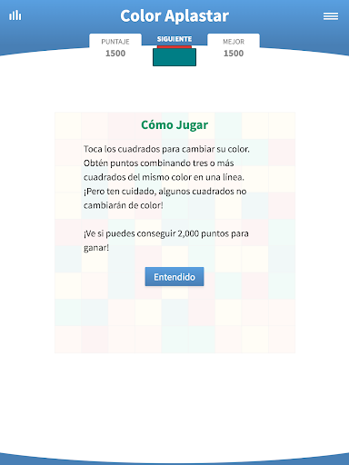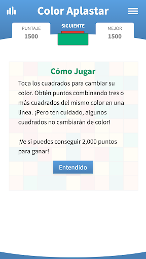 El objetivo es tocar y eliminar tantas fichas del tablero como sea posible. El juego comienza con un tablero de celdas cuadradas llenas de colores al azar. Toca una celda para cambiar su color al color que se muestra arriba del tablero. Combina tres o más fichas adyacentes con el mismo color para eliminar las fichas del tablero y ganar puntos. Si no se pueden combinar tres o más fichas adyacentes en el próximo toque, el juego termina. Perfecciona tu estrategia y mantén el juego durante el mayor tiempo posible para aumentar y maximizar tu puntuación. ¡Ve si puedes conseguir 2,000 puntos para ganar! Pero ten cuidado, ¡algunas celdas no cambiarán de color!