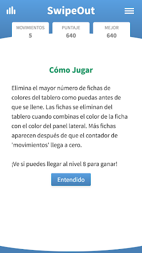 El objetivo es eliminar tantas fichas de colores del tablero como sea posible. Las fichas de colores sólo se podrán eliminar través de los paneles laterales de su mismo color. Más fichas aparecen después de que el contador de movimientos llega a cero, así que piensa cada movimiento y actúa estratégicamente. Cada vez que eliminas una ficha del tablero tus puntos suben. ¡Mientras más alta sea tu puntuación, más difícil se vuelve el juego! Perfecciona tu estrategia y mantén el juego durante el mayor tiempo posible para aumentar y maximizar tu puntuación. ¡Ve si se puedes llegar al nivel 8 para ganar!