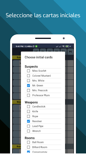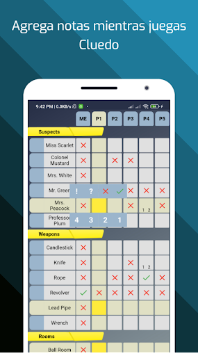 Esta aplicación está pensada para ser utilizada en sustitución del papel y el lápiz para encontrar la combinación final en el juego Cluedo.