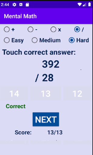 Realice las operaciones de matemáticas simples en su mente para darle un buen ejercicio a su cerebro.Se pueden seleccionar diferentes niveles según lo deseado.