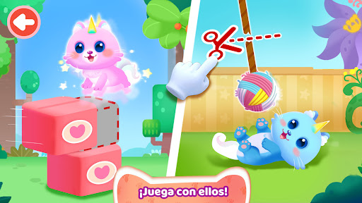 Tobogán, golpea al topo, pelotas... hay 16 interacciones listas para que te diviertas. ¡Ven a jugar con tus gatitos! Juega a las escondidas con los gatitos. ¿En cuál cartón se esconden? El gatito quiere columpiarse. ¡Ayúdalos! ¡Crea momentos felices en el mundo de gatitos!