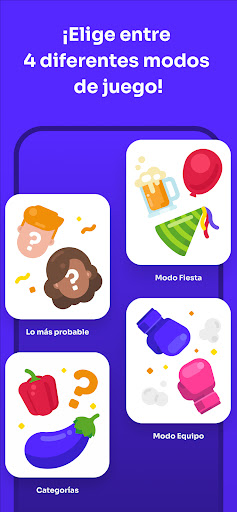 - Múltiples modos de juego: Elige entre los modos de juego "Modo Fiesta", "Modo Equipo", "Lo Más Probable" o "Categorías" para variar las cosas.