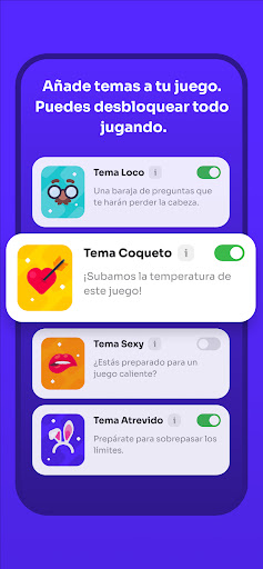 - Varios temas: Elige entre diferentes temas, cada uno con un conjunto único de preguntas y desafíos para añadir emoción y diversión a tu juego. Ya sea que estés de humor para una noche loca con tus amigos, una velada coqueta con tu crush o una aventura emocionante y atrevida, Boomit Party tiene un tema para satisfacer tus preferencias.