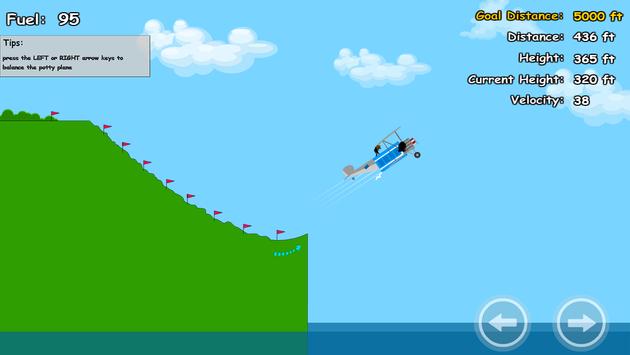 Tu objetivo para ir al baño es simple: aprende a volar lo más lejos y lo más alto posible. Lanza el potty racer, cuando esté en el cielo, controla y equilibra para volar. Volar te recompensa con oro para gastar en mejoras para ir al baño, mejorar tu rampa, velocidad y potenciadores, aprender a volar la próxima vez.