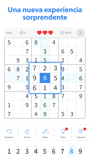 - Pista: ¡Cuando no puedas seguir, usa una Pista y obtén una solución del sudoku solo para esa celda!