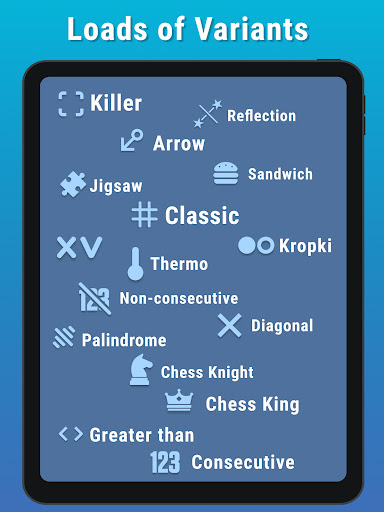 * 19 variantes de Sudoku : Clásico, Killer , Sandwich , Palindrome , Thermo , Consecutive , Non-consecutive , Diagonal , Arrow , Kropki , XV , Reflection , Jigsaw , Mayor que, Windoku , Quadruple , Bishop , Chess King de Chess Knight de ajedrez.