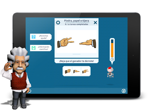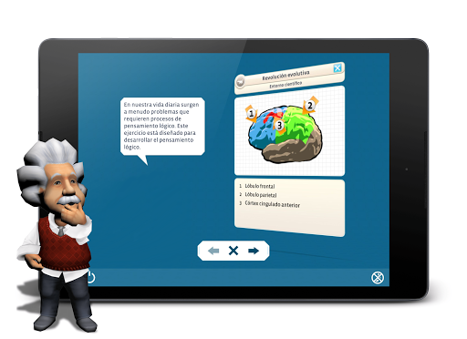 Albert Einstein y su simpático ayudante Robo te acompañarán durante el juego. Estarán a tu lado cuando los necesites y te explicarán los diferentes ejercicios con ilustraciones de la base científica aplicable. Te motivarán para que sigas adelante y te preocupes por tu condición cerebral.