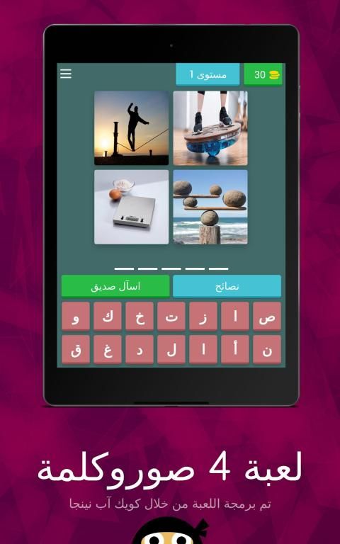 أربع صور تعبر عن كلمة واحدة.. هل تستطيع معرفتها لعبة مشوقة و رائعة تهدف لتنمية مهارات التفكير المنطقي و الفكري لدى اللاعب مع تنمية ثقافة اللغة العربية.