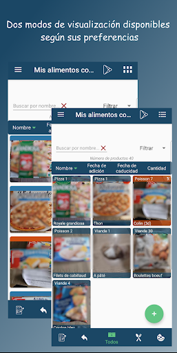 My Freezer le permite administrar sus alimentos congelados por varios elementos: tipo de producto (pizza), nombre (4 quesos), fecha de adición, fecha de caducidad y cantidad. Hay dos modos de visualización disponibles según sus necesidades.