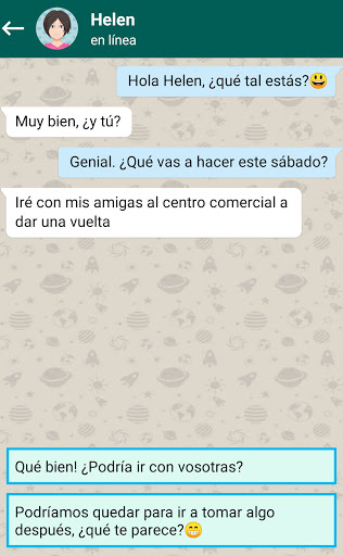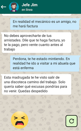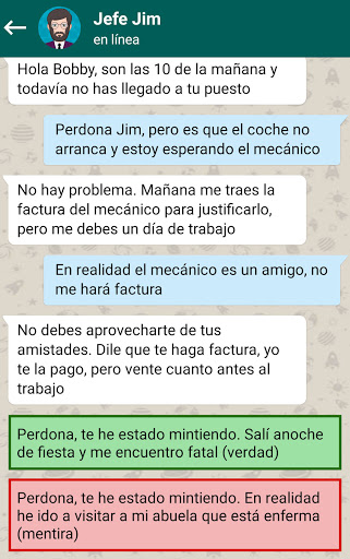 Chat Master en español te hace enfrentarte a complicadas situaciones de chat de las que tendrás que salir, como entrevistas de trabajo, tratar con amigos exigentes, pedir a tu compañero de clase que salga contigo, gastar una broma a tu padre, pedir un aumento a tu jefe, y muchas más situaciones complicadas o divertidas.
