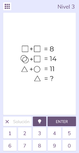 La relación entre los números debe resolverse en figuras geométricas y completar los números que faltan al final. Cada rompecabezas y tiene un nivel diferente y los jugadores que tienen una fuerte capacidad de pensamiento analítico, conocen el modelo de inmediato.
