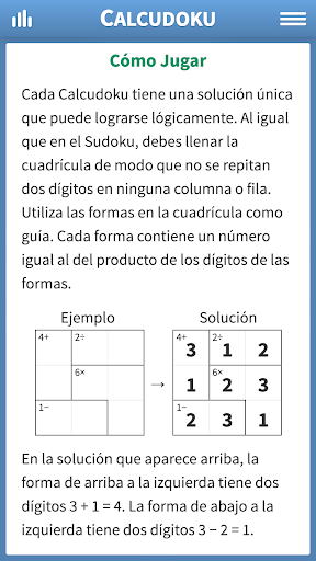 Cada Calcudoku tiene una solución única que puede lograrse lógicamente. Al igual que en el Sudoku, debes llenar la cuadrícula de modo que no se repitan dos dígitos en ninguna columna o fila. Utiliza las formas en la cuadrícula como guía. Cada forma contiene un número igual al del producto de los dígitos de las formas. Por ejemplo una forma con tres celdas con el número 6 puede tener valores de las celdas 1, 2 y 3, como 1 x 2 x 3 = 6. ¡Acepta un desafío mayor con cuadrículas más grandes para expertos, hasta un tamaño de 9x9!