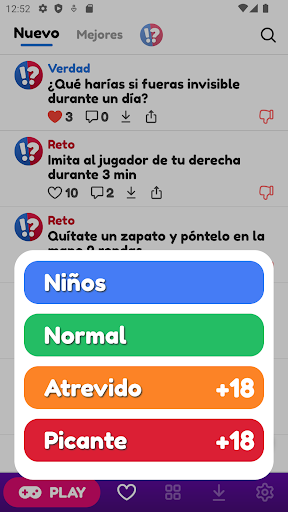 Incluye preguntas incomodas y un modo de Verdad o Reto picante para poder jugar a prenda o como app de desafío picante. Este modo es solo para adultos y contiene preguntas picantes y juegos extremos.
