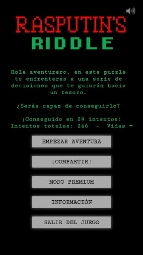 Resuelve este trepidante juego dando la respuesta correcta a las preguntas que se te van formulando. No te preocupes si de vez en cuando fallas y mueres, siempre dispondrás de un nuevo intento. Intenta aprender lo máximo posible de tus aciertos y de tus errores para resolverlo en el menor número de intentos posibles. ¿Estás listo?