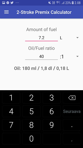2-Stroke Premix Calculator is a fast and simple application to help you calculate the correct amount of 2-Stroke oil to be mixed with gas.