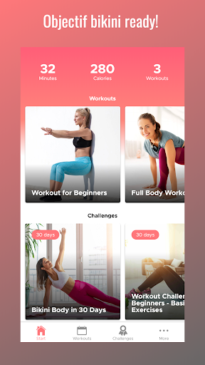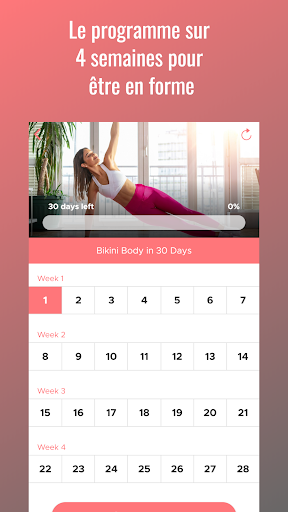 Un programme de formation réussi nécessite un suivi et des progrès. Le suivi de votre condition physique vous rendra plus susceptible de l'améliorer. Ce programme est un programme à domicile, ce qui signifie qu'il ne nécessite aucun gymnase. Vous pouvez faire n'importe quel exercice à la maison sans équipement. C'est formidable pour les débutants de commencer à s'entraîner. Il n'est jamais trop tard pour commencer à travailler sur votre "Bikini Body". Ces entraînements rapides et à haute intensité sont parfaits pour ceux d'entre vous qui manquent de temps, et les exercices stimulant le métabolisme vous permettront de brûler des calories après l'entraînement. Cette application est la méthode ultime de perte de poids pour les femmes.