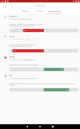 Le Test Complet 5GMARK (Full Test) vous permet de connaitre le score atteint par votre connexion (Smartphone, sur un réseau à un instant précis et dans des conditions propres) en effectuant un Test plus long, incluant la navigation web et le streaming Youtube avec le relevé des échecs de chargement (Erreurs, temps dépassés…Etc.).