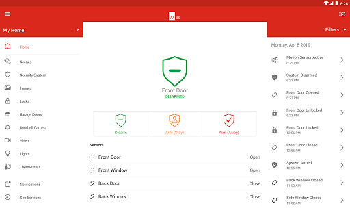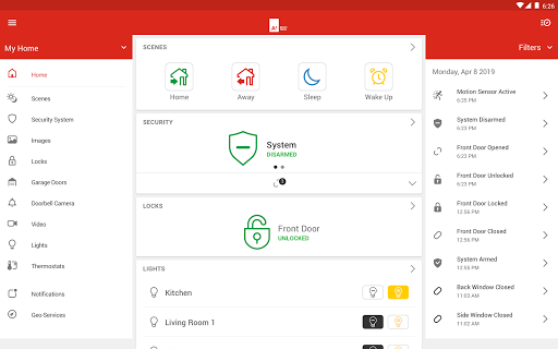 Obtenez des alertes sur n'importe quel appareil mobile qui vous permet Sachez que votre système est armé / désarmé, votre porte de garage est ouverte, votre porte d'entrée est déverrouillée et lorsque vos caméras voient quelqu'un.