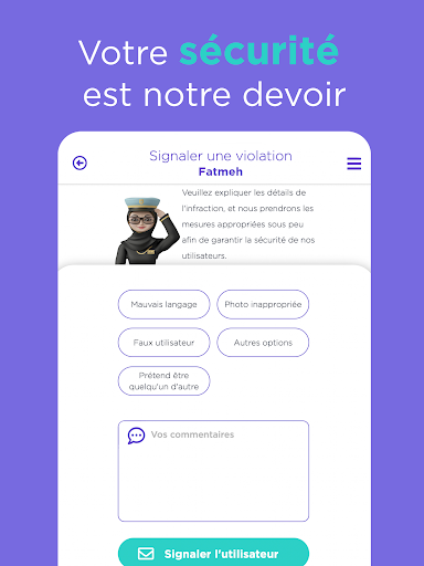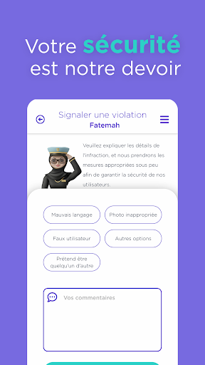 Pour assurer la sécurité de nos utilisateurs, AlKhattaba est conçu exclusivement pour les rencontres matrimoniales. Les utilisateurs peuvent tchatter directement entre eux tant qu’ils respectent les règles de l’application qui protègent les traditions islamiques. Toute calomnie ou inconduite provenant d’un utilisateur donné peut être signalée par l’autre utilisateur. L’équipe de soutien de l’application dédiée à répondre aux questions et aux plaintes 24/7 examine ces cas signalés et prend les bonnes mesures à leur égard, y compris le bannissement des profiles abusifs de l’application.
