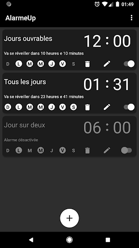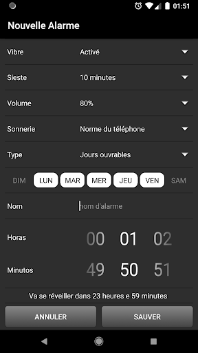 L'alarme la plus simple et la plus pratique, faite pour que vous ne manquiez jamais l'heure de vos rendez-vous. Avec son interface claire et objective, vous avez toutes les informations sur les alarmes enregistrées dans l'écran principal. Ayez un nom, un jour pour vous réveiller et le temps restant pour que l'alarme sonne.