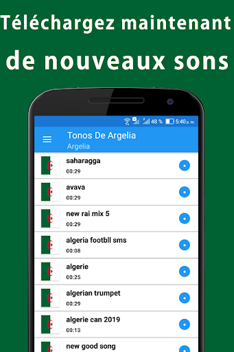 Connectez-vous à tous les sons de la meilleure application de sonnerie musicale algérienne originale pour téléphone portable 2020 en ligne, créez une liste de vos sons de message préférés. Écoutez tous les sons des flûtes et des tambours, les sons des messages musique gratuite sonneries raï, les sons de toutes sortes pour les messages en sonnerie de musique arabe pour les appels, les sons de sonnerie arabe pour téléphone portable 2019 gratuits, les sonneries avec des chansons arabes, les sons de l'hymne algérien pour mobile notifications, meilleures chansons sonores en Algérie, sons de mélodies harmoniques en langue arabe.