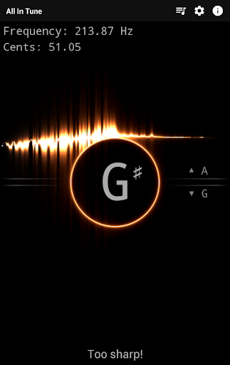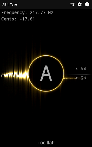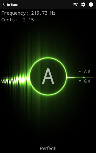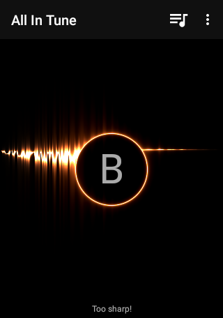 Après avoir ouvert l'application, vous verrez une visualisation du signal audio d'entrée. La note détectée sera affichée au milieu de l'écran et un message d'état complémentaire sera affiché en bas. Ajustez votre instrument vers le haut ou le bas lorsque vous observez le message d'état ou la visualisation de réglage. Lorsque l'écran s'allume en vert et que le message d'état indique "Parfait!", Tu es en phase. Il est recommandé d'accorder votre instrument dans un environnement calme.