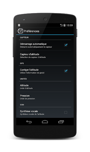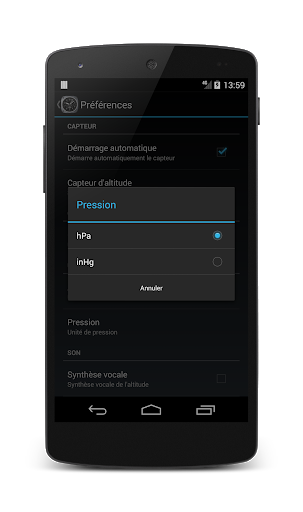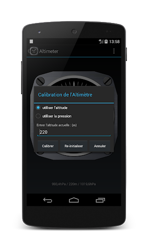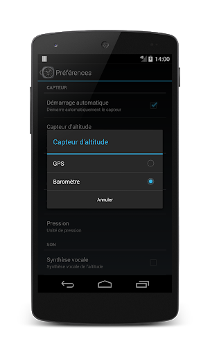 (*) Ces fonctions nécessitent un capteur de type barométrique dans votre appareil android : tablette Motorola Xoom 1, Google Samsung Nexus, Google LG Nexus 4, Google LG Nexus 5, Samsung Galaxy Note 2, Samsung Galaxy S4, ...